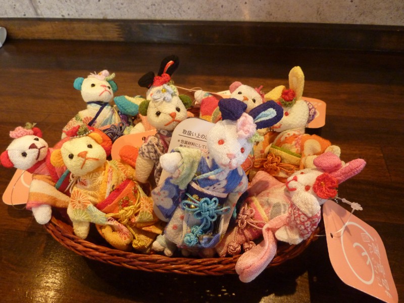 うさぎ、くまの人形たちが京都のちりめんでつくられた、鮮やかな色合いの振袖をまとっています。髪飾りや手にバッグをもっていたり、とっても可愛いマスコットですよ♪ プレゼントにも是非どうぞ!